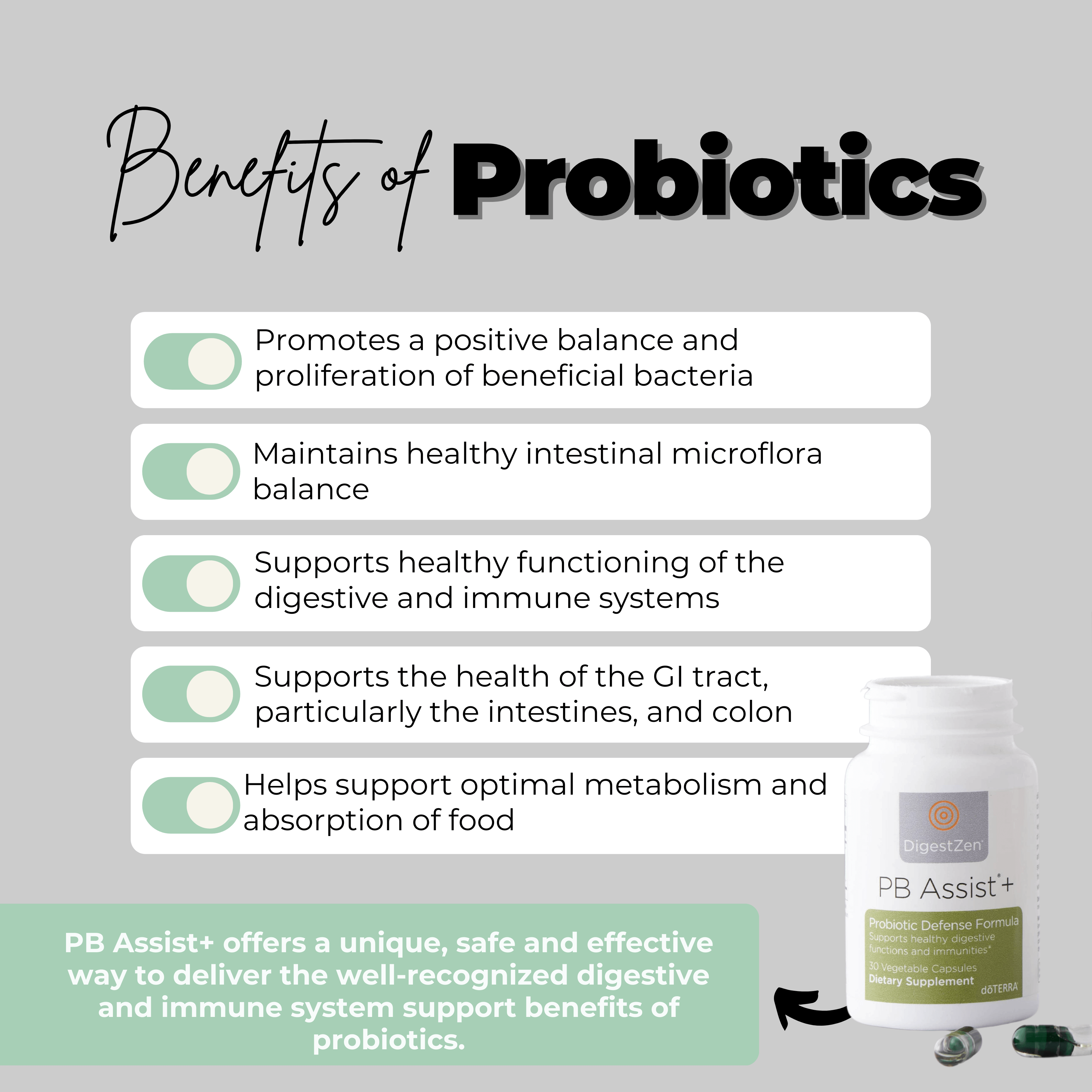 dōTERRA’s PB Assist is your daily probiotic containing both pre-biotic fiber as well as 6 different strains of probiotic microorganisms housed in a unique double layer vegetable capsule. The time released double capsule delivery system ensures that the 6 million CFUs of active probiotic cultures stay protected from stomach acid and end up in the gastrointestinal tract. The purpose of PB Assist is to facilitate and encourage healthy bacterial growth in the digestive system. This is important because our gastrointestinal system is responsible for digesting and absorbing nutrients from the foods we eat as well as eliminating waste products. Good bacteria also help keep our immune system running in tip top shape. It is so important to focus on our microbiome health especially this time of year!