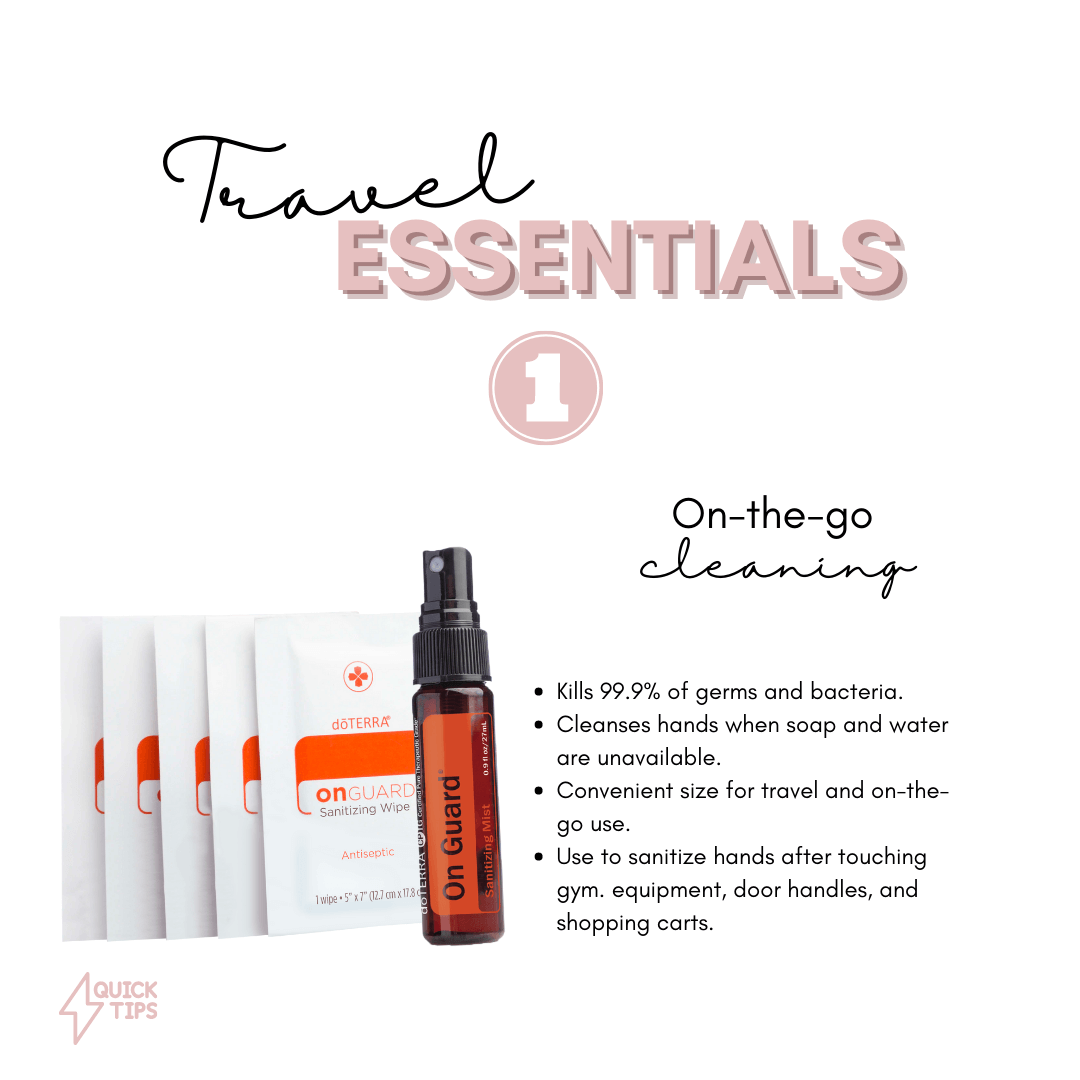 On the go cleaning is super important when traveling. Just think of flying and pulling the food tray down, was it really cleaned before you got on??? Just in case I always bring wipes or Onguard spray to make sure germs aren't going to affect my trip.