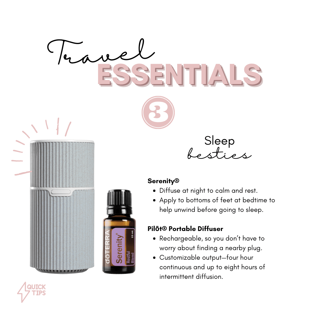 Sleep isn't always something that comes easy when you travel, especially if kids are involved. My kids are always complaining that someone is breathing too loud, snoring, tossing and turning, etc. Serenity and my diffuser to the rescue. A drop on everyone's feet before bed and a full diffuser helps so much. Don't forget your diffuser, trust me.
